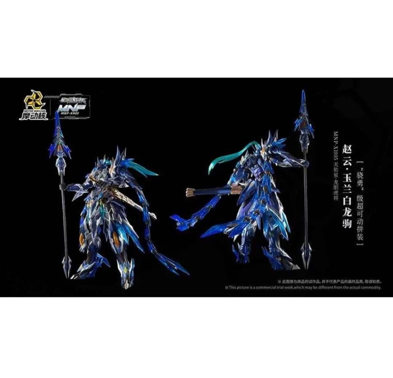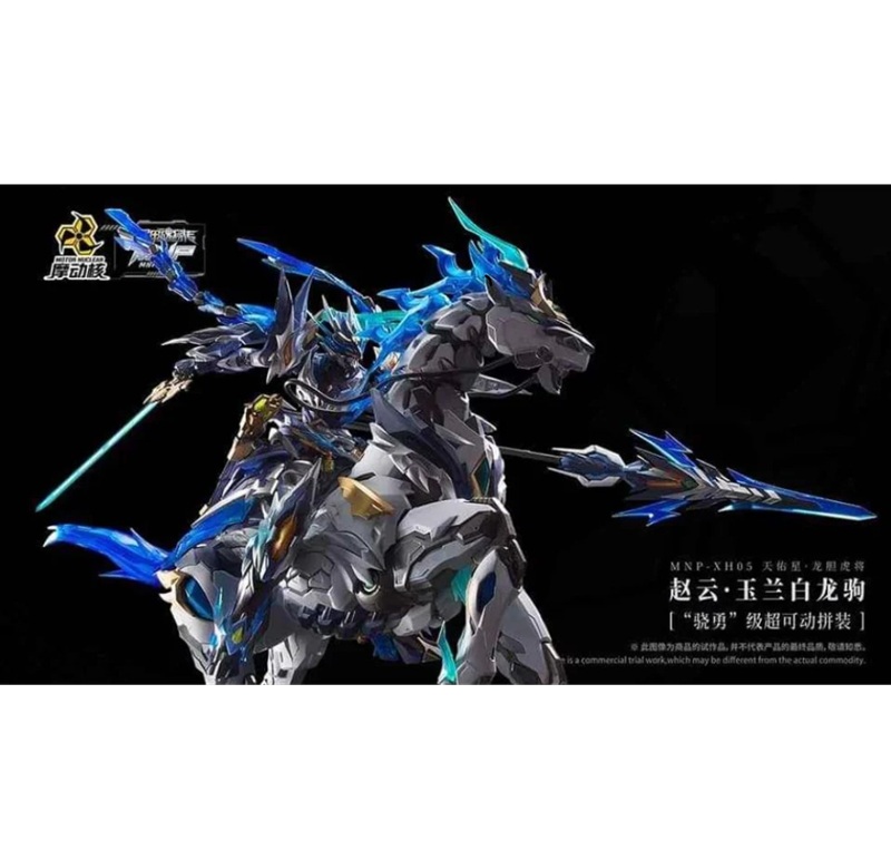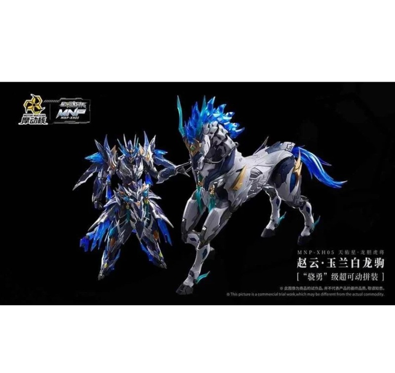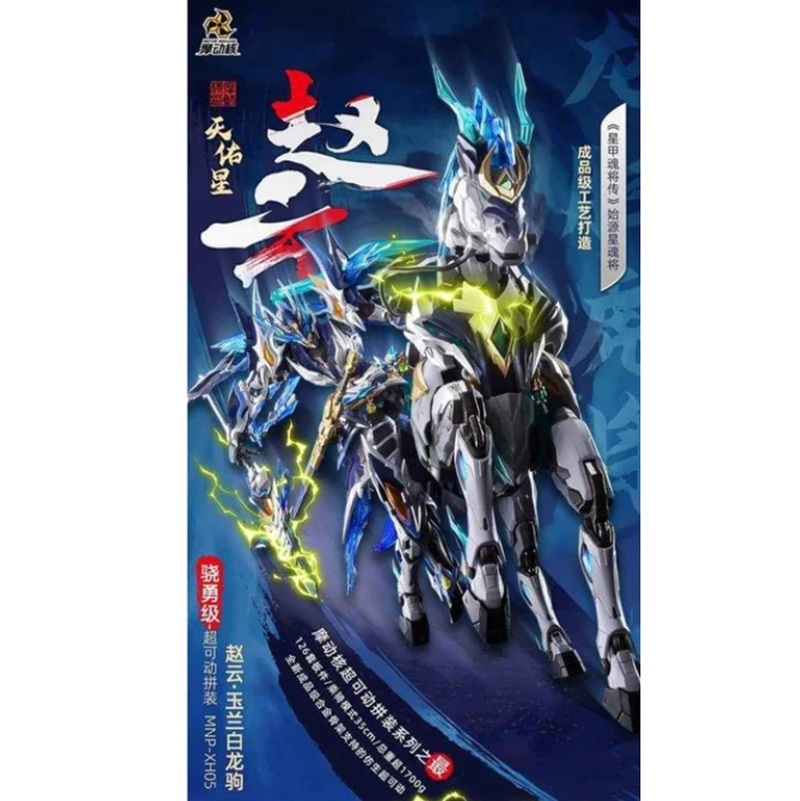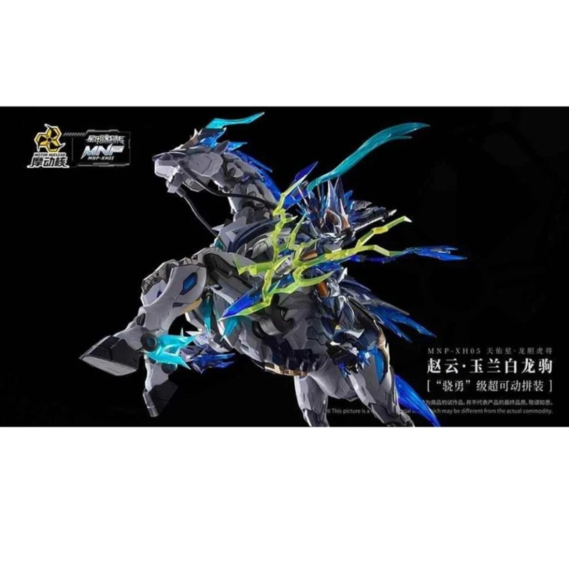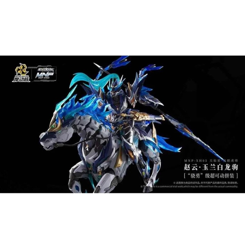 Motor Nuclear MNP-XH05 Zhao Yun 1/100. Il model kit definitivo con cavallo meccanico, ali di energia blu e finiture metallizzate pre-colorate. Design epico e stabilità superiore.